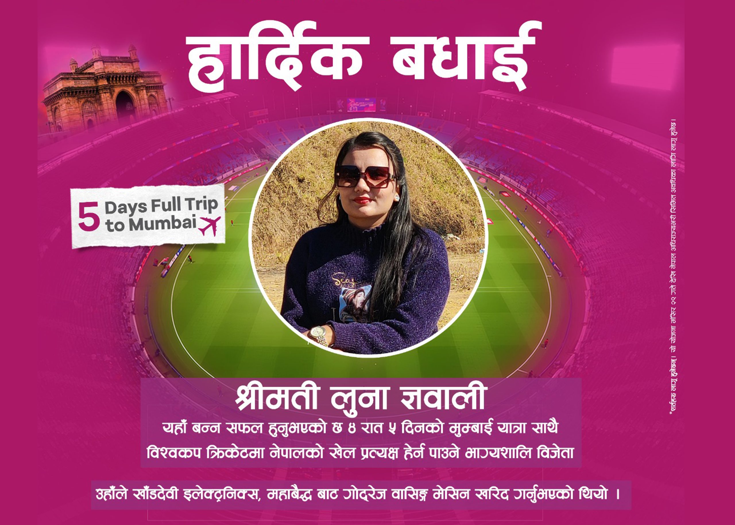 छनोट भएकी विजेता ज्ञवालीले ४ रात ५ दिनको मुम्बई यात्रासहित वानखेडे स्टेडियममा नेपाली राष्ट्रिय क्रिकेट टोलीको खेल प्रत्यक्ष हेर्ने अवसर पाउनेछिन् । यो प्याकेजमा हवाई टिकट, होटल बसाइ, म्याच टिकट तथा अन्य आवश्यक सम्पूर्ण खर्च गोदरेज नेपालले नै व्यहोर्ने जानकारी दिएको छ ।