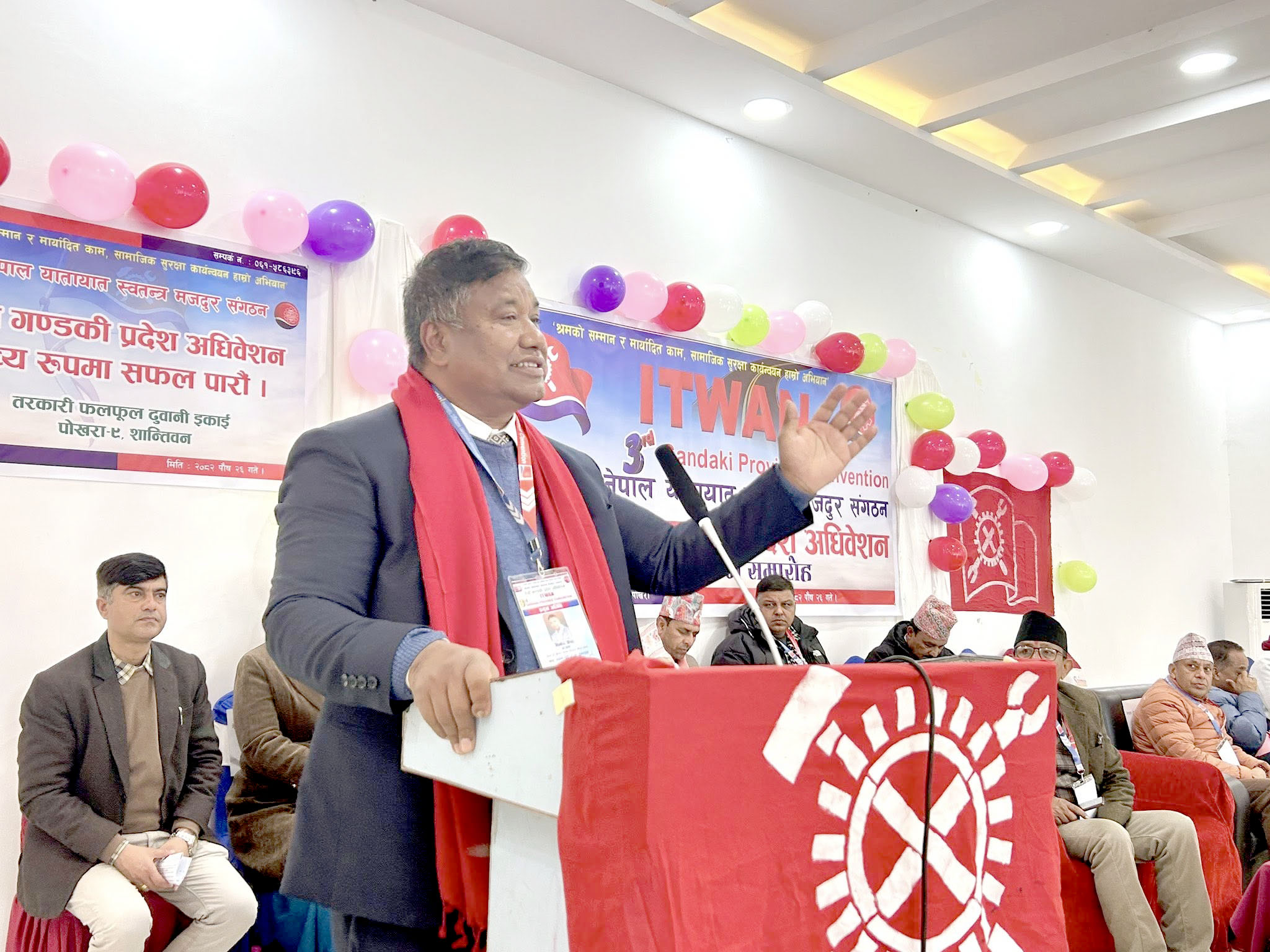 पोखरा । नेपाल यातायात स्वतन्त्र मजदुर संगठन तेस्रो गण्डकी प्रदेश अधिवेशन शनिबार भएको छ । नेपाल ट्रेड युनियन महासंघ (जिफन्ट) राष्ट्रिय कमिटीका अध्यक्ष विनोद श्रेष्ठले राजनीतिक पार्टीको नेता हिसाबले काम गर्न मजदुरलाई निर्देशन दिए । लुकेर पार्टीको काम गर्ने होइन, मजदुरहरु खुला राजनीतिमा आउन पर्छ,’ उनले भने, ‘आगामी दिनमा कराउने, माग्ने ठाउँमा होइन, मजदुर निर्णय गर्ने ठाउँमा पुग्न आवश्यक छ ।’