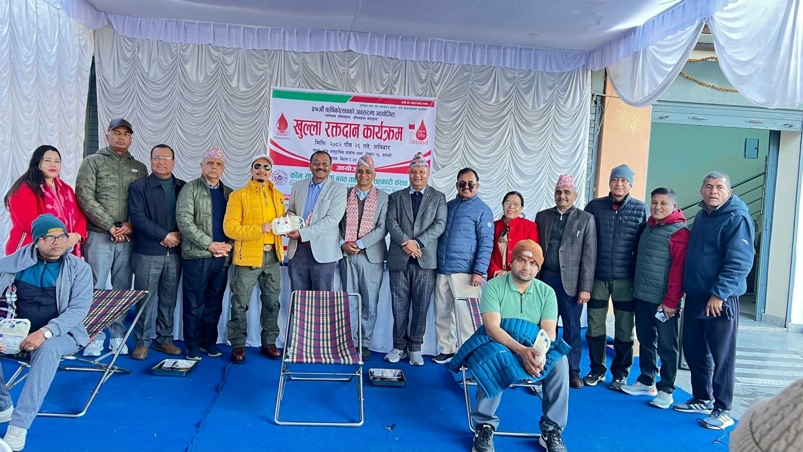 संस्थाका निवर्तमान अध्यक्ष तीर्थबहादुर बस्नेतले पहिलो रक्तदाता संस्थाका साधारण सदस्य राजु भट्टलाई ब्लड ब्याग हस्तान्तरण गर्दै कार्यक्रम सुरुआत गरे । सो अवसरमा निवर्तमान अध्यक्ष बस्नेतले स्वस्थ जीवनका लागि नियमित स्वास्थ्य परीक्षण, सन्तुलित आहार र आवश्यक पर्दा स्वेच्छिक रक्तदान अत्यन्तै उपयोगी हुने बताए ।