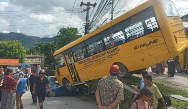 घारीपाटनमा ट्याक्सीमाथि खस्यो स्कुल बस